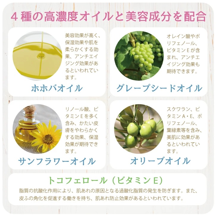 ☆オイルは4種類(オリーブオイル、サンフラワーオイル、グレープシードオイル、ホホバオイル)をたっぷり配合
