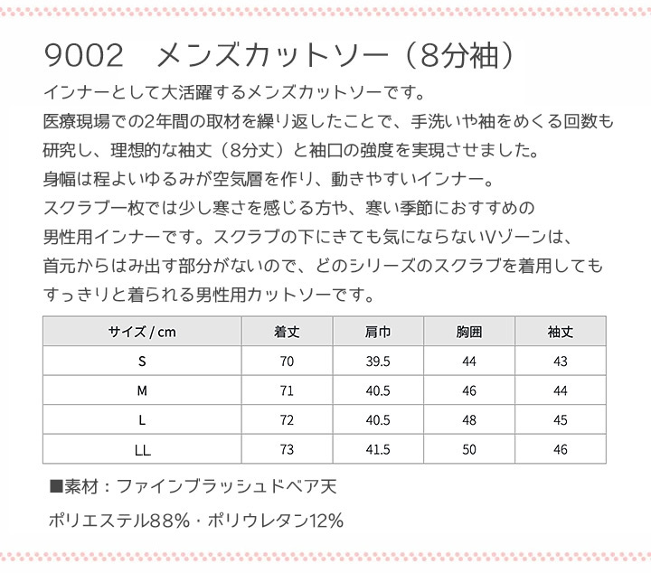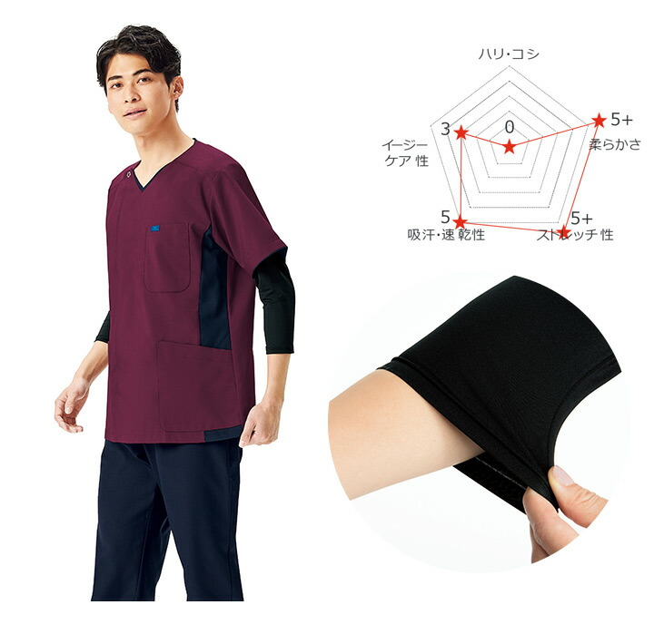 スクラブ一枚では少し寒さを感じる方や、寒い季節におすすめの男性用インナーです。スクラブの下にきても気にならないVゾーンは、首元からはみ出す部分がないので、どのシリーズのスクラブを着用してもすっきりと着られる男性用カットソーです。