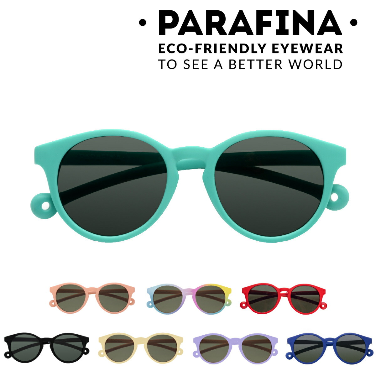 フレームにリサイクルされたタイヤゴムを使用した、環境に優しいキッズサイズのサングラスです。お子様の体型により異なるため目安サイズとなりますが、対象年齢は6才〜9才となっています。