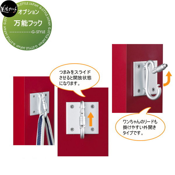 特徴 | ワンちゃんのリードも掛けやすい外開きタイプです。つまみをスライドさせると開放状態になります。 ※使用荷重:50kg |