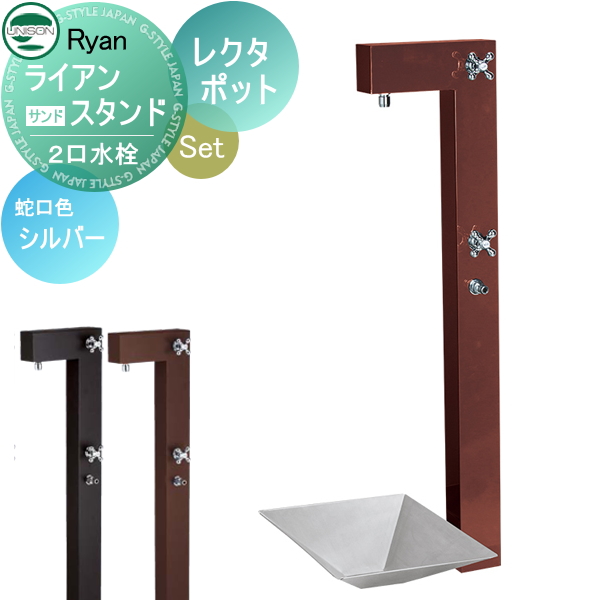 商品名 | 【ライアンスタンド(サテンカラー)+レクタポット セット】 イメージ 水栓柱:サテンブラウン パン:レクタポット 蛇口:シルバー おしゃれ かわいい ガーデニング 庭まわり 屋外 水道 水廻り |