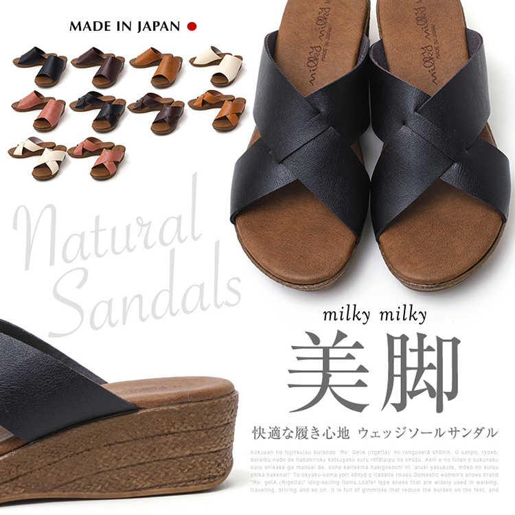 【milky milky/ミルキーミルキー】ミュールタイプでサッと履ける!シンプルで流行に左右されない、1足は持っておきたい定番サンダル♪甲部分には触り心地の良いソフトな人工皮革を使用。しっかりホールドして「脱げにくい」。約5cmのウェッジソールで安定感があり美脚効果も期待できます!アウトソールは滑り止め加工を施しているので安心。[原産国]:MADE IN JAPAN(日本)[素材]:アッパー/合成皮革、アウトソール/合成底[サイズ]:S(22.0-22.5cm)/M(23.0-23.5cm)/L(24.0-24.5cm)/LL(24.5-25.0cm)[ヒール高さ]:約5cm[重量]:Mサイズ片足で約170g[配送重量]:約500g