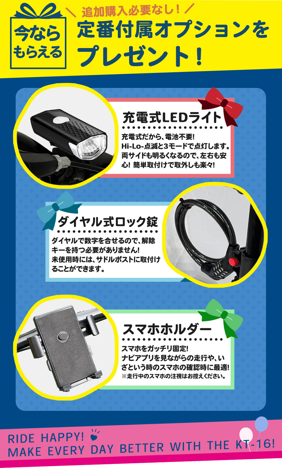 ■付属品:フロントライト・ワイヤーロック錠・スマホホルダー・簡易工具・取扱説明書