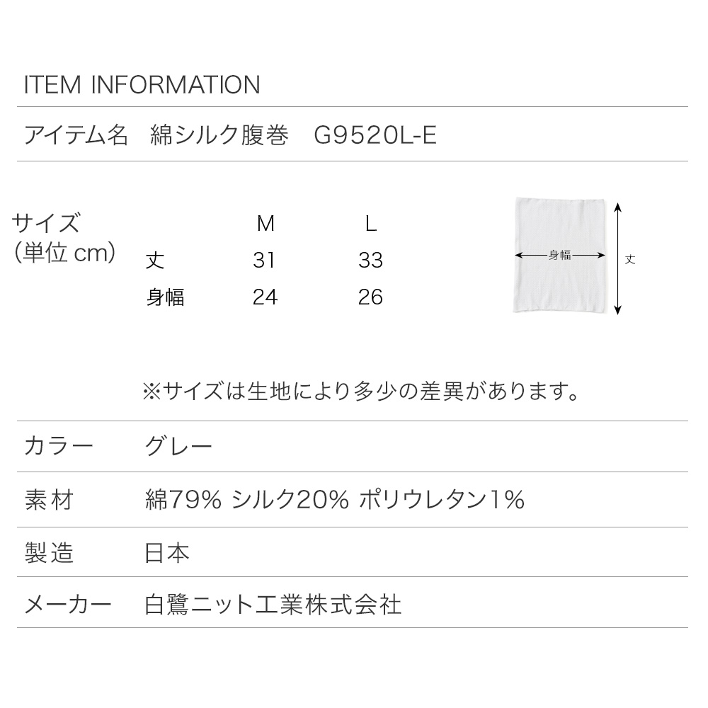 はらまき レディース 絹 コットン 冷え取り 温活 年間 オールシーズン 温かい 夏 冷房 対策 吸水性 保湿性 お肌に優しい 薄手 腹巻 腹巻き 妊活 女性 婦人 下着 肌着 日本製 締め付けない 伸びる made in japan グレー 灰色 G9520L-E 爆買