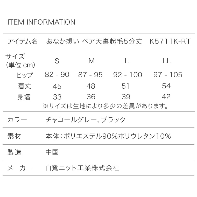 アイテム名:2枚セット おなか想いベア天裏起毛5分丈 K5711K-R