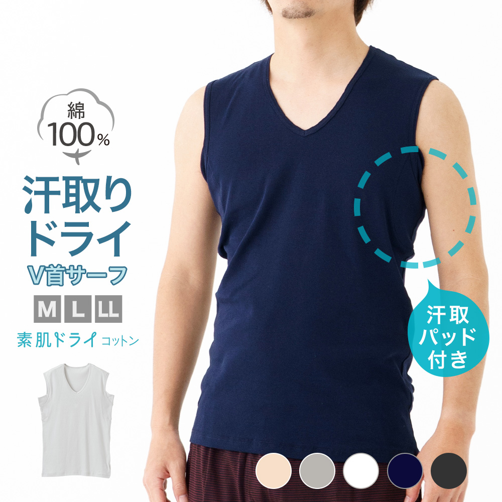 素肌ドライ 綿100% 汗取り インナー サーフ V首 メンズ 春夏 脇汗 シャツ パッド付き ドライ 汗染み 防止 汗 対策 シャツ 綿混 汗とり パット付き 吸汗速乾 肌着 紳士 男性 ホワイト/グレー/ベージュ/ブラック/ネイビー M/L/LL M4440P-E 爆買