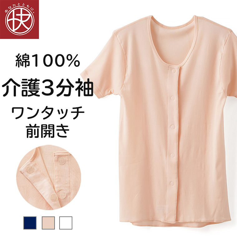前開き 半袖シャツ 介護 綿100% レディース 年間 ワンタッチ マジックテープ ボタン 抗菌防臭 シニア 婦人 女性 下着 肌着 インナー 介護用品 入院用 病院用 こころよい オフホワイト/ピンク M/L/LL Q5011T-E 爆買