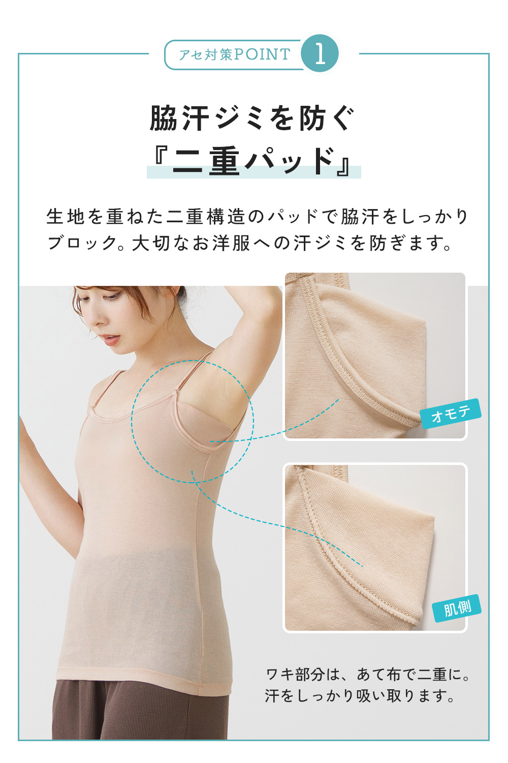 2枚セット キャミソール 脇汗 汗取り インナー 脇汗パッド付き レディース 春夏 素肌ドライ 汗染み 綿混 吸汗速乾 コットン さらさら 涼しい 夏用