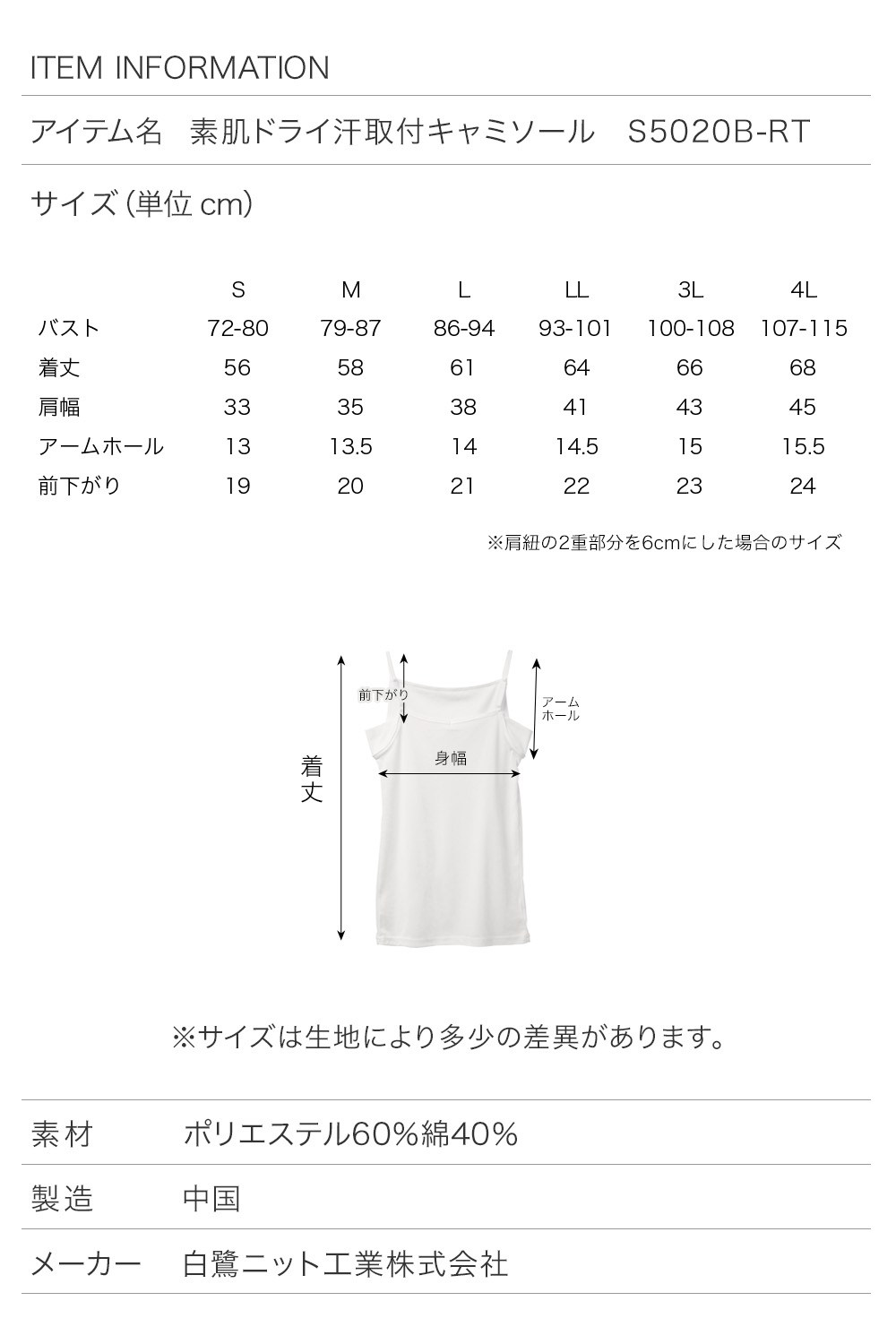 アイテム名: 素肌ドライ汗取付キャミソール S5020B-RT