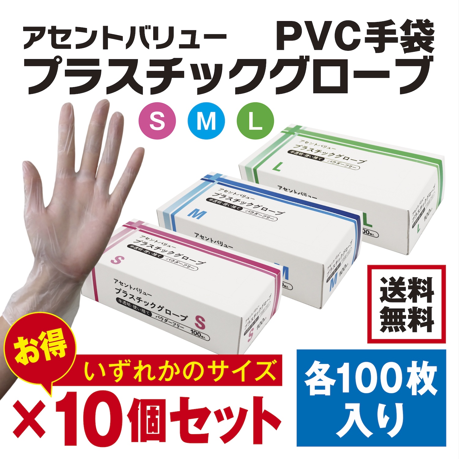【送料無料】10個セット プラスチック手袋(パウダーフリー)アセント S・M・Lサイズ ビニール手袋 100枚/10箱 使い捨て 介護用 PVC 作業用 業務用 水仕事