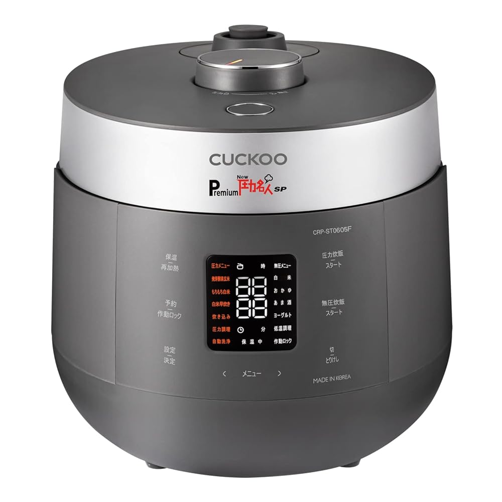| 主な仕様 | 【New圧力名人シリーズ最新モデル】PremiumNew圧力名人がさらに進化して新登場。圧力と無圧を切り替えて炊飯するツインプレッシャー機能搭載。玄米は高圧力でふっくらもちもちに、白米は高火力でふっくらやわらかく炊き上げます。白米も玄米も絶品の炊き上がりに。(玄米4合・白米6合)【手軽に発芽酵素玄米を】通常3日間寝かせて作る発芽酵素玄米。圧力名人は独自の技術によって炊きあがりからすぐにお召し上がりいただけます。遠赤外線効果により、ふっくらとして旨味があり美味しい発芽酵素玄米をご自宅で簡単に取り入れることができます。ボタン1つで発芽・炊飯・保温が全自動。簡単だからこそ酵素玄米生活を続けることができます。【これ1台で多彩な料理ができる】圧力調理と低温調理コースでローストビーフや肉じゃがなど簡単に作ることができます。また腸内環境を整えるあま酒やヨーグルトコースもある多機能炊飯器です。【こだわりの内釜】内釜はブラックダイヤモンドコーティング。炭と鉄鉱石が含まれて、熱伝導率が高くお米の芯まで熱を伝えることが出来るのでふっくらと甘味のある炊き上がりに。二重モーション圧力パッキンは強力な密閉力でごはんの旨みを保ち、炊き上がりに近い風味で保温します。※ブラックダイヤモンドコーティングとはフッ素加工の一種です。PFOSやPFOAともに使用しておりません。食品衛生法の試験も適合した商品ですのでご安心ください。【オリジナルレシピ本・専用蒸し器付き】圧力調理・低温調理コースを使った43品のオリジナルレシピ本付き。和食から洋食まで幅広いメニューが掲載。専用蒸し器を使えば蒸し料理も簡単に作れます。【商品詳細】メーカー?:CUCKOO / 色:?マットホワイト、アーバングレー / 最大容量:?1.08 L / 商品重量:?5.9 kg / 付属品:取扱説明書、レシピ本、蒸し器、計量カップ、しゃもじ、掃除用ピン ※海外では使用できません。 |