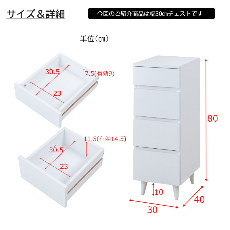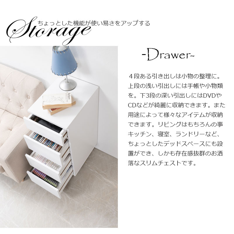 チェスト 幅30cm 4段 30cm おしゃれ ホワイト 収納家具 コンパクト 木製 北欧 スリム 引出し リビング 寝室 ランドリー すき間収納 すき間 隙間 DVD 小物