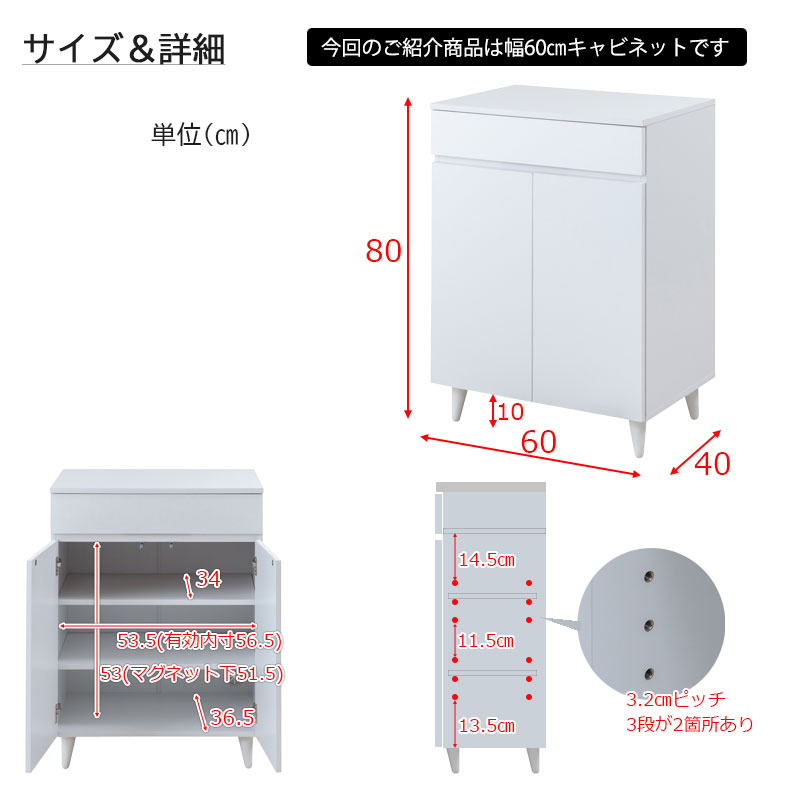 扉内寸:(約)幅53.5(有効56.5)×奥行36.5(棚板34後部1cm配線用隙間あり)×高さ53(マグネット下51.5)cm