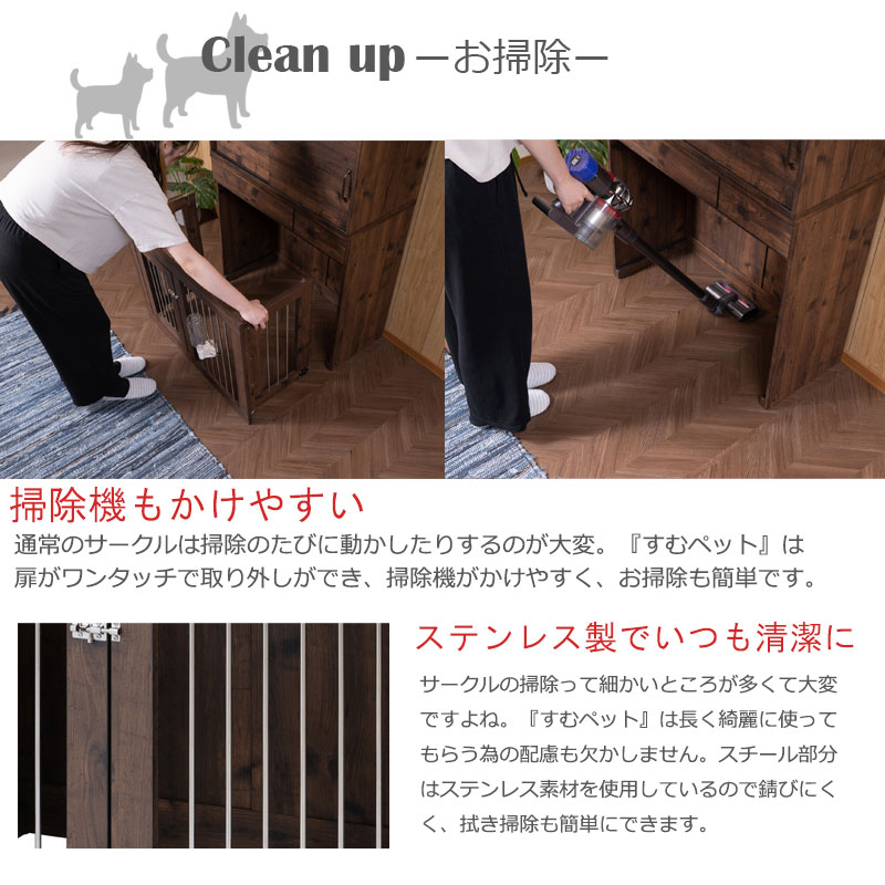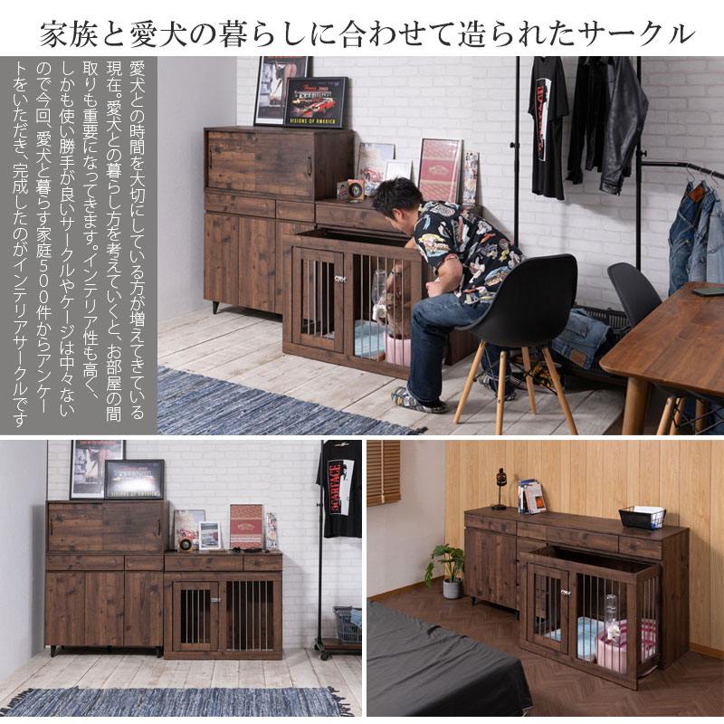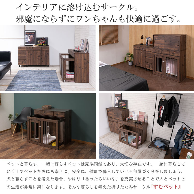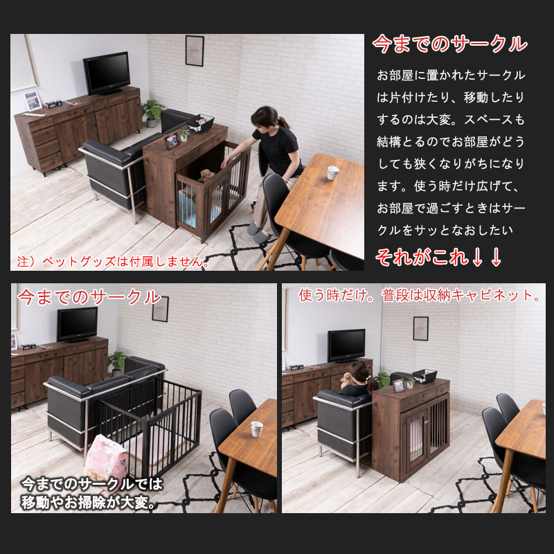 便利な機能のサークル収納も付いたドッグサークルは、愛犬をサークルに入れるときだけ広げるので、普段は収納キャビネットのように使えるのが魅力。