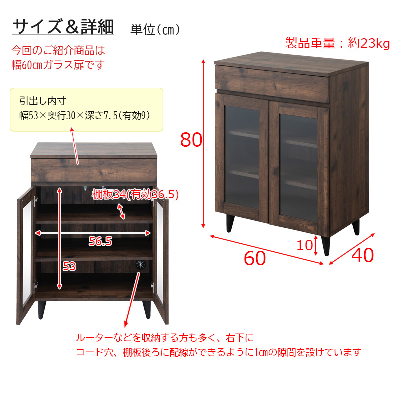 扉内寸:(約)幅53.5(有効56.5)×奥行36.5(棚板34・後部1cm配線用隙間あり)×高さ53(マグネット下まで51.5)cm