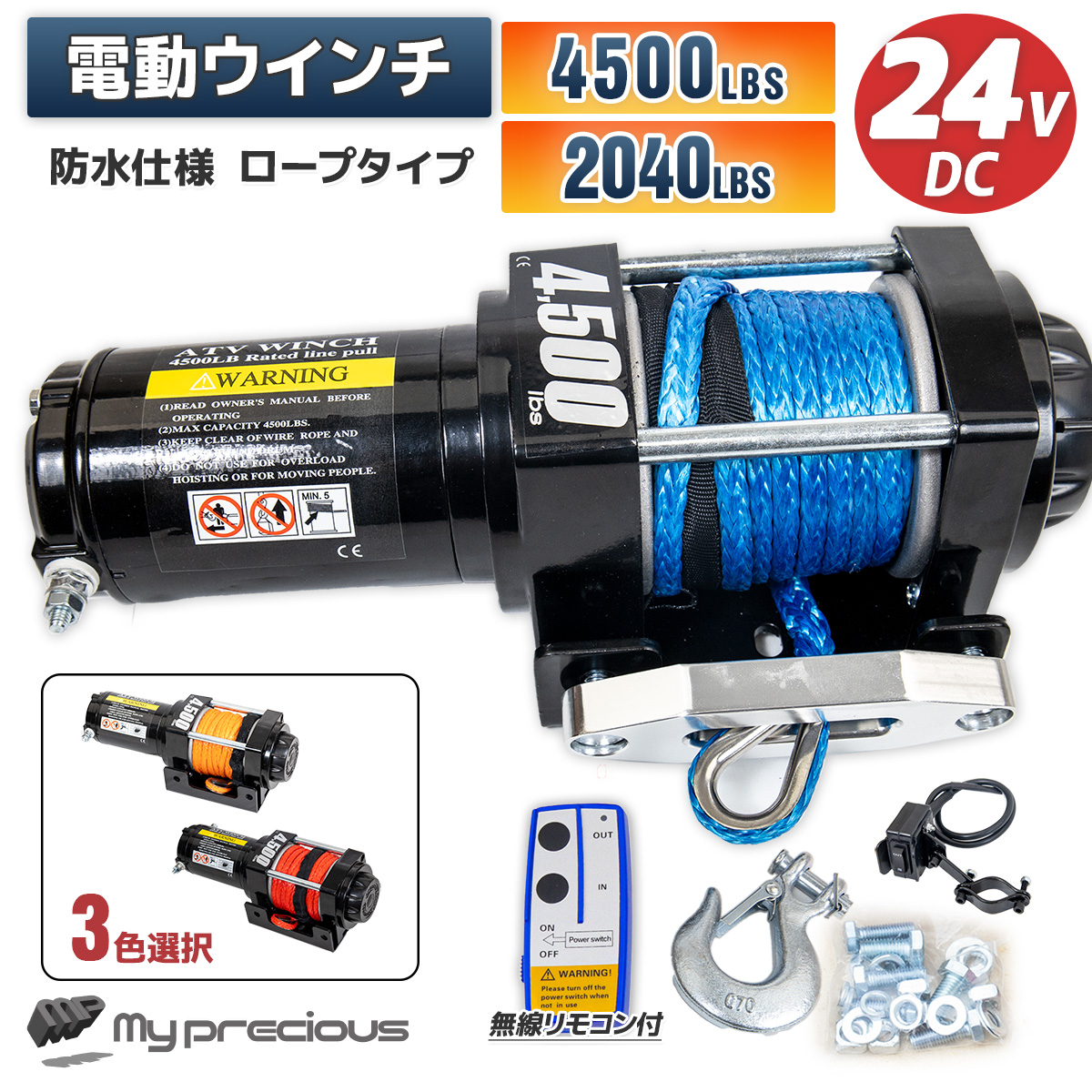 DC24V 電動ウインチ 牽引力4500LBS(2040kg) 荷を傷つけにくい ナイロンロープタイプ クラッチ機構付き 強力ハイパワー