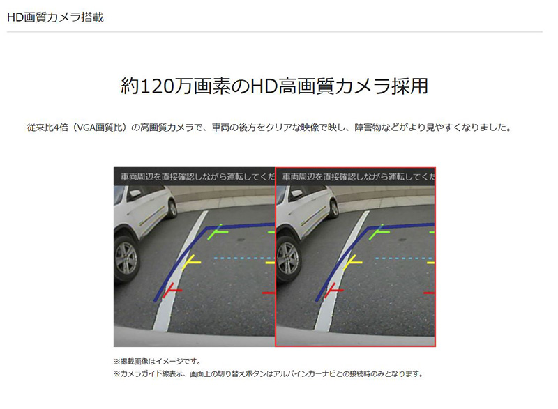 アルパイン製カーナビと接続することでカメラ映像内に運転をサポートするガイド線を表示。