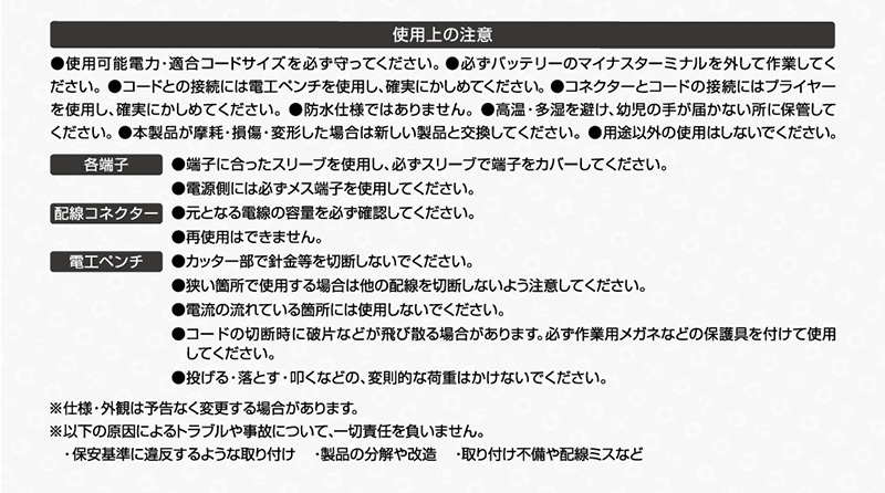 | ◆配線作業に必要なアイテムが揃う便利なセット ◆確実な圧着ができ、コード切断・被覆剥きなどができる多機能電工ペンチをセット ◆小さな端子が取り出し易い底面R形状 ◆収納・整理に便利な透明ケース ◆フタに便利なスケール付き(15cm目盛り(目安)) 【使用可能電力/適合コードサイズ】 ▼ギボシ端子・平型端子(250型) クワ型端子(φ6)・丸型端子(φ8) ・DC12V車200W以下/DC24V車400W以下 ・AV(S)0.5〜2sq ▼配線コネクター(赤) ・DC12V車110W以下/DC24V車220W以下 ・AV(S)0.5〜0.85sq 【内容物】 ・電工ペンチ×1 ・ギボシ端子セット×8 ・ギボシ端子セット(ダブル)×2 ・平型端子セット(250型)×4 ・クワ型端子セット(Φ6)×3 ・丸型端子セット(Φ8)×3 ・配線コネクター(赤)×2 ※画像はイメージです。実際の商品とは異なる場合がございます。 ※パッケージにつきましては、メーカーの仕様変更等により予告なく変更になる場合がございます。パッケージの違いによる返品・交換は承っておりませんので予めご了承ください。 | |