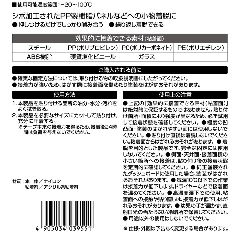 | ◆大きなシボ面対応 ◆樹脂パネルへの小物着脱に ◆シボ加工されたPP製樹脂パネルの小物着脱に ◆押しつけるだけでしっかり噛み合う ◆繰り返し着脱できる 《効果的に接着できる素材(粘着面)》 スチール・PP(ポリプロピレン) PC(ポリカーボネイト)・PE(ポリエチレン) ABS樹脂・硬質塩化ビニール・ガラス 【ご購入される前に】 ●確実な固定方法については、取り付ける物の取扱説明書にしたがってください。 ●接着力が強いため、はがす際に接着面を傷めたり塗装をはがすおそれがあります。 【使用上のご注意】 商品ページ掲載画像をご覧くださいませ。 ※画像はイメージです。実際の商品とは異なる場合がございます。 ※パッケージにつきましては、メーカーの仕様変更等により予告なく変更になる場合がございます。パッケージの違いによる返品・交換は承っておりませんので予めご了承ください。 | |