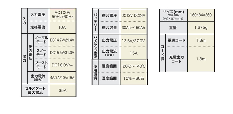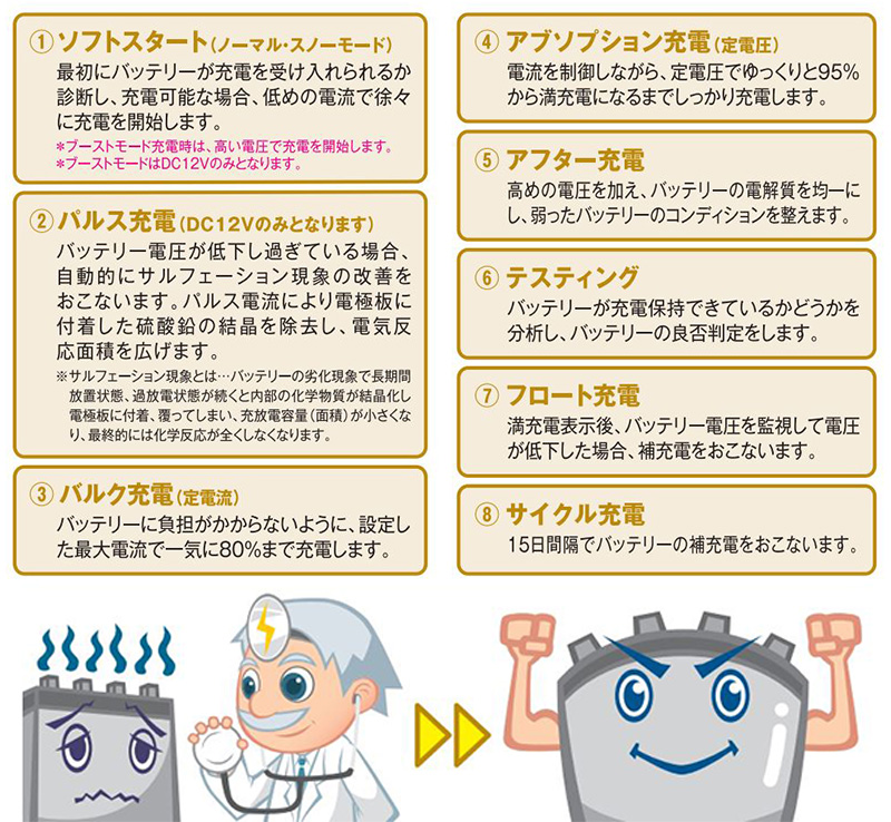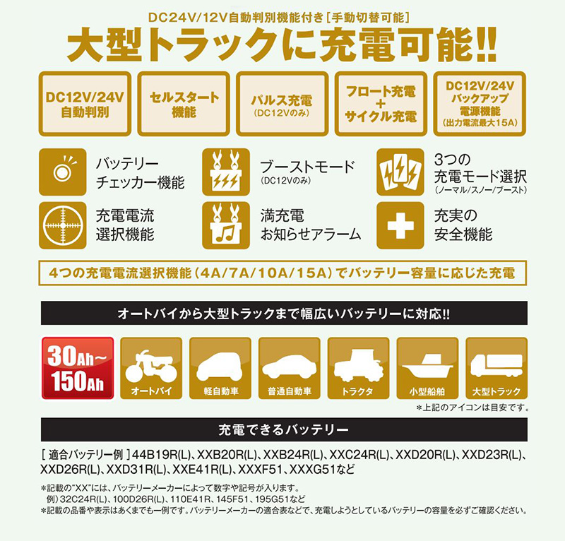 12V/24Vを自動判別。バッテリーの状態を診断しながら充電するので、過充電を防止しながらバッテリーを痛めることなく最適な電圧で充電可能。大型車両対応。