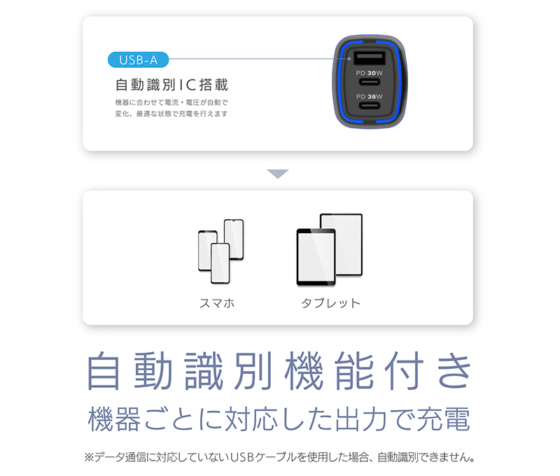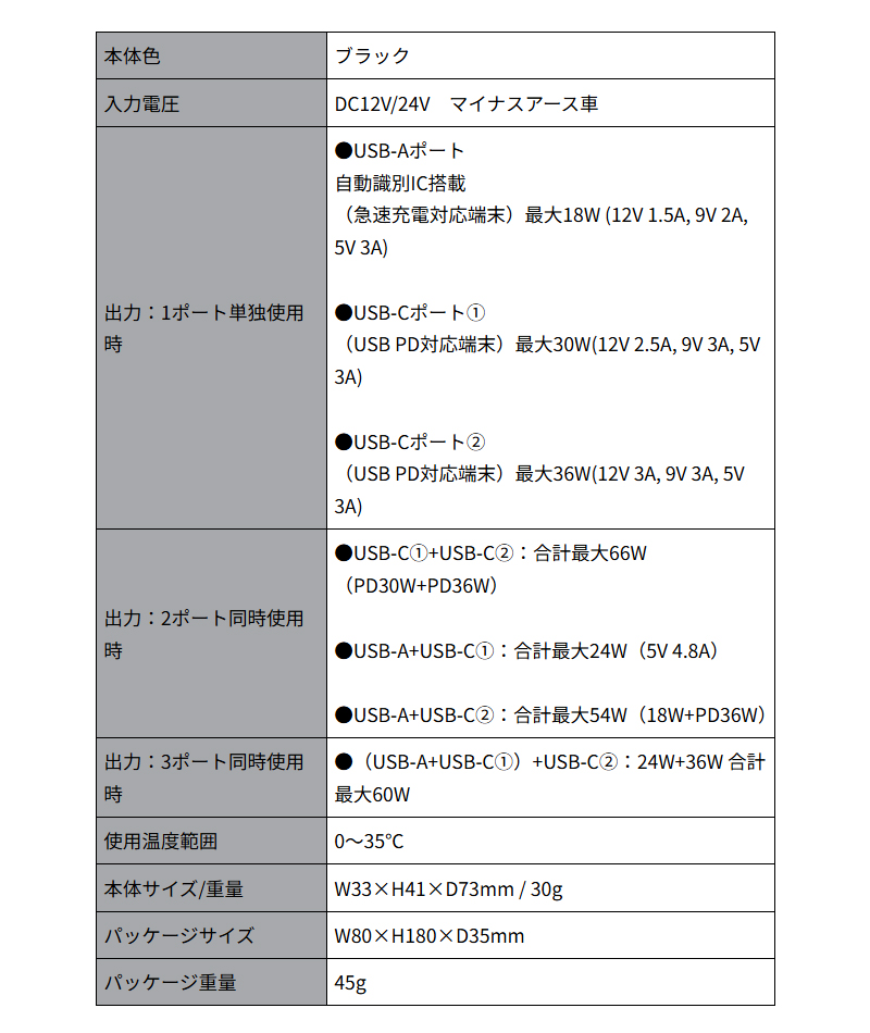 車のDCソケットを3ポートのUSB電源に変換。スマートフォン/タブレット/ノートPC等を充電・給電。PD規格対応USB、Type-Cポート最大36Wと最大30Wの2ポート搭載。