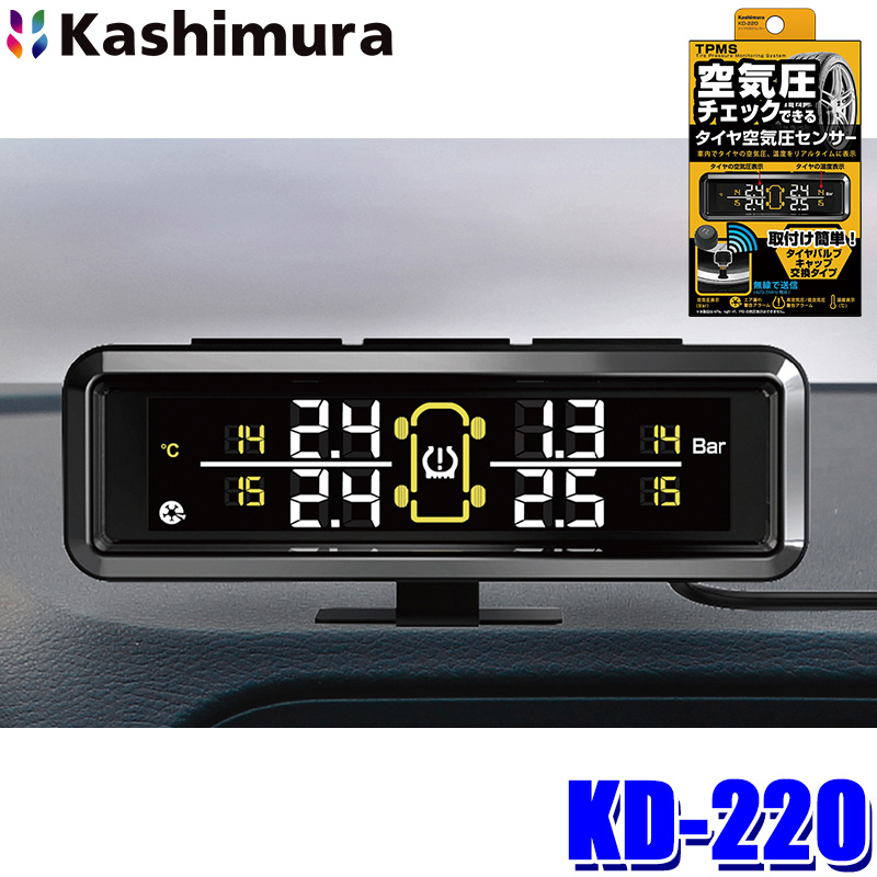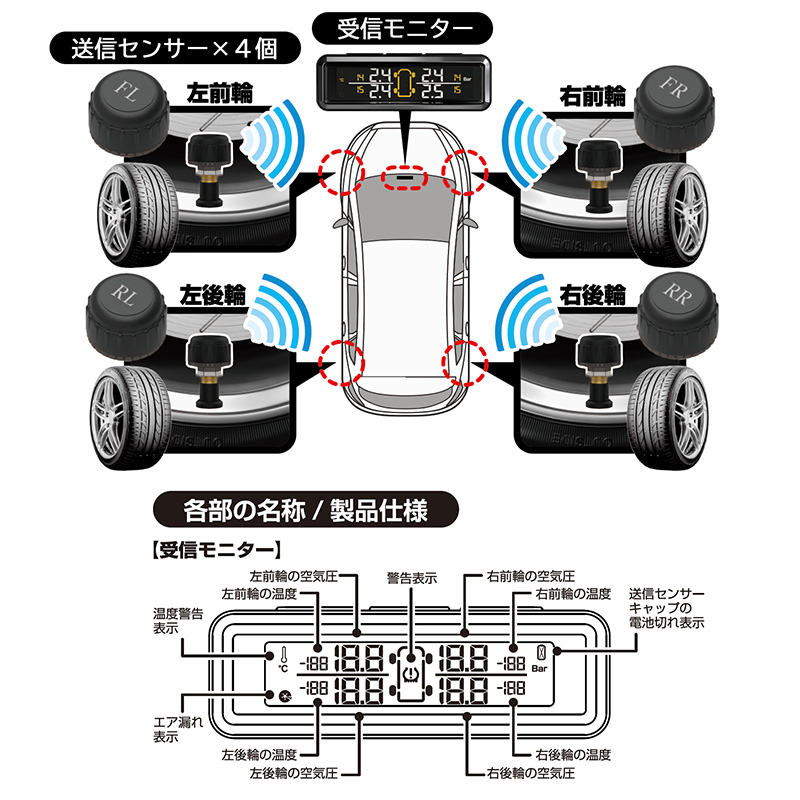 | ●車内でタイヤの空気圧/温度をチェックできる、空気圧センサー。 ●TPMSとは、Tire Pressure Monitoring System(タイヤ・プレッシャー・モニタリング・システム)の略でタイヤの空気圧や温度を送信センサーキャップで測定し、無線で車内の受信モニターに情報を送り、リアルタイムで空気圧、温度を確認できるモニターです。 ●安心の電波法認証品。 ●ハイプレッシャー(高空気圧)、ロープレッシャー(低空気圧)アラーム機能。 ●エア漏れ検知アラーム機能。 ●温度警告表示機能。 ●電池切れ表示機能。 ●USB給電式。配線しやすいロングコード長3m。 ●受信モニター取り付け用の金属ステー付属。 ●タイヤエアバルブキャップ交換タイプ。 ※本製品にUSB電源となる機器は付属しておりません。 ※車種によっては、ホイールカバーに送信センサーが干渉し、取り付けができない場合があります。 ※国土交通省の定める保安基準に適合させるため、送信センサーが車両のフェンダ面より飛び出さないように取り付けるスペースをご確認ください。 ※本製品は、トラック・バスなどの大型車、中型車には対応しておりません。 ※画像はイメージです。実際の商品とは異なる場合がございます。 ※パッケージにつきましては、メーカーの仕様変更等により予告なく変更になる場合がございます。パッケージの違いによる返品・交換は承っておりませんので予めご了承ください。 | |||