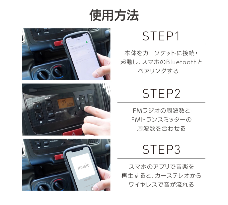 スリム&コンパクト!Bluetooth対応のスマートフォン/iPhoneの音楽やワンセグ音声をワイヤレスで受信、カーステレオから聴くことが可能。周波数を選ぶだけの簡単操作。