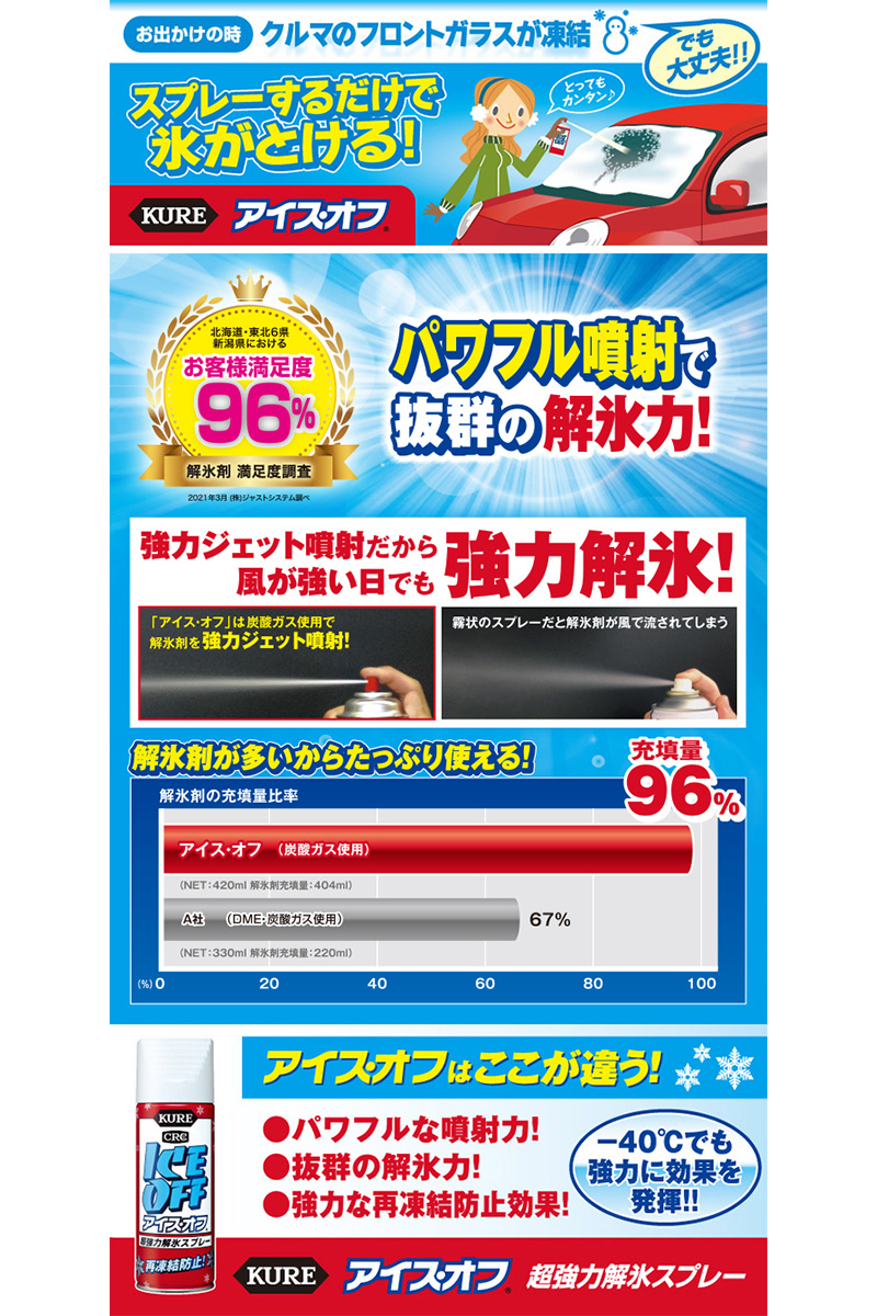自動車の窓ガラスに付いた氷や霜をすばやく溶かし、再凍結も防止する強力解氷剤。特殊アルコールの強力な溶解力と、炭酸ガスの強い噴射力で、瞬時に氷を溶かします。