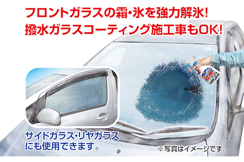 ガラス面に氷結した雪や霜を素早く溶かす!撥水シリコーンがガラス面をコーティングするので溶かした氷の再凍結を防止。ガラスコーティング車にも使用可能。