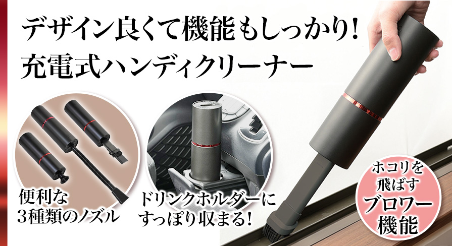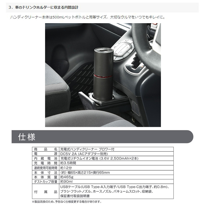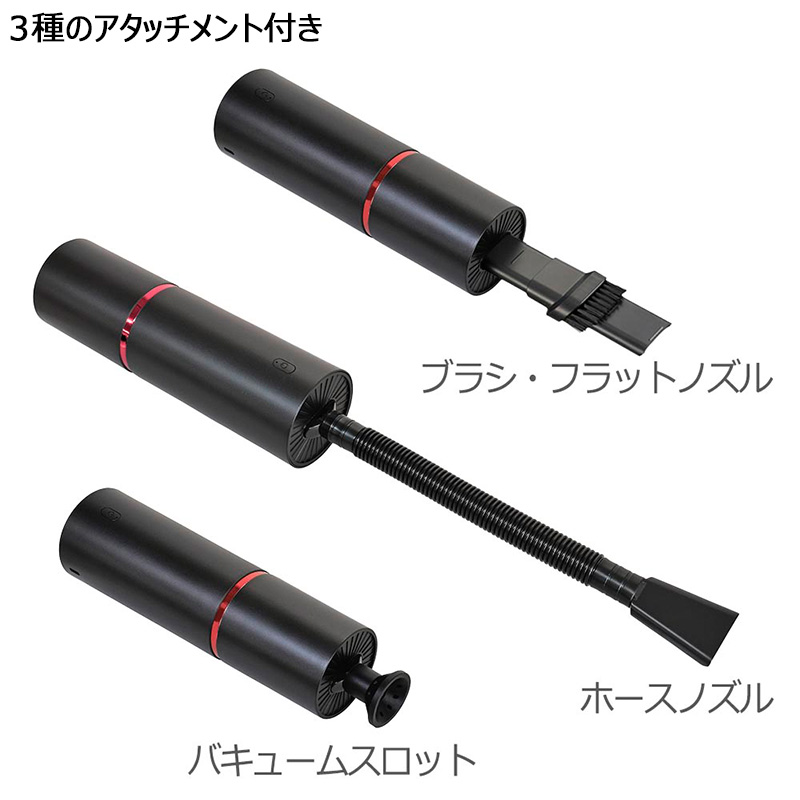 | ● 車載のドリンクホルダーに収まるコンパクトな円柱形デザイン ● シックな黒を基調とし赤のラインが映えるスタイリッシュなボディカラー ● タイプCポート搭載の充電式。USB(Type-A/Type-C)ケーブル付属 ● 3種のアタッチメント付き ・ ブラシ・フラットノズル(布やすき間の掃除に) ・ ホースノズル(エアコンの上やソファーの下の掃除に) ・ バキュームスロット(圧縮袋の吸い込みに) ● アタッチメントを送風口に取り付けてブロワーとしてもご使用できます。 ● ゴミはダストカップに集められます。 ● 本体とアタッチメントを収納できる袋付き ● 家で、職場で、ペットの抜け毛の掃除にも。気軽に使えて便利です。 ※画像はイメージです。実際の商品とは異なる場合がございます。 ※パッケージにつきましては、メーカーの仕様変更等により予告なく変更になる場合がございます。パッケージの違いによる返品・交換は承っておりませんので予めご了承ください。 |