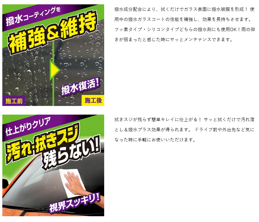 サッと拭くだけで汚れを落とし、撥水効果を与える外窓ガラス専用ウェットクロス。使用中の撥水ガラスコートの性能を補強し、効果を長持ちさせます。