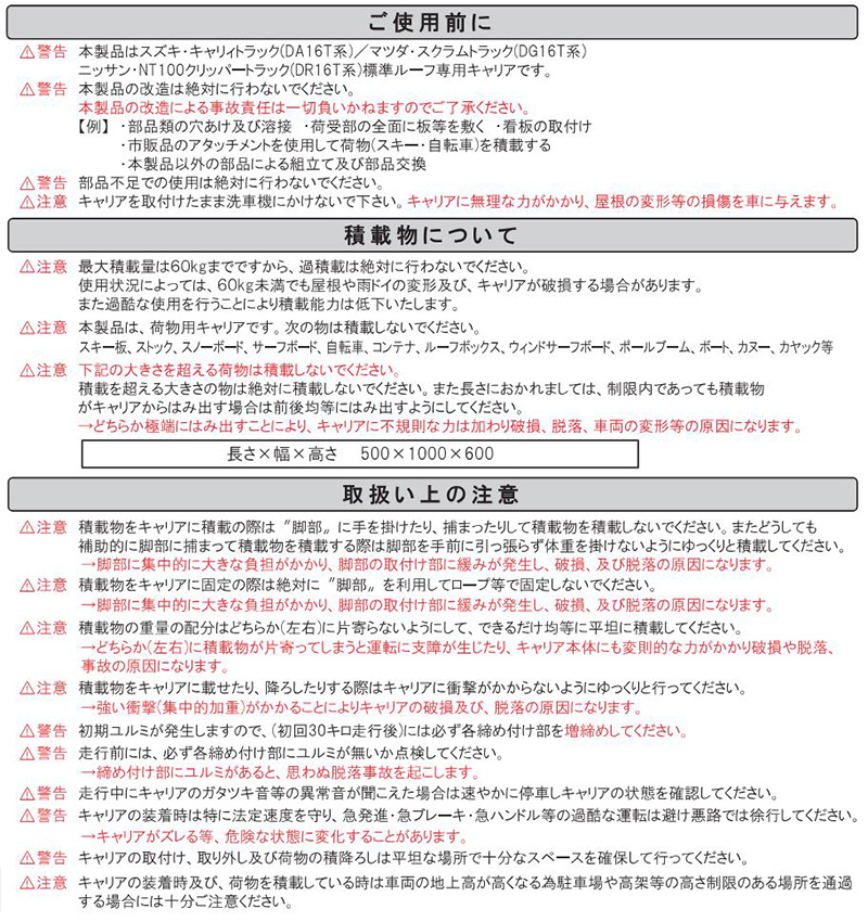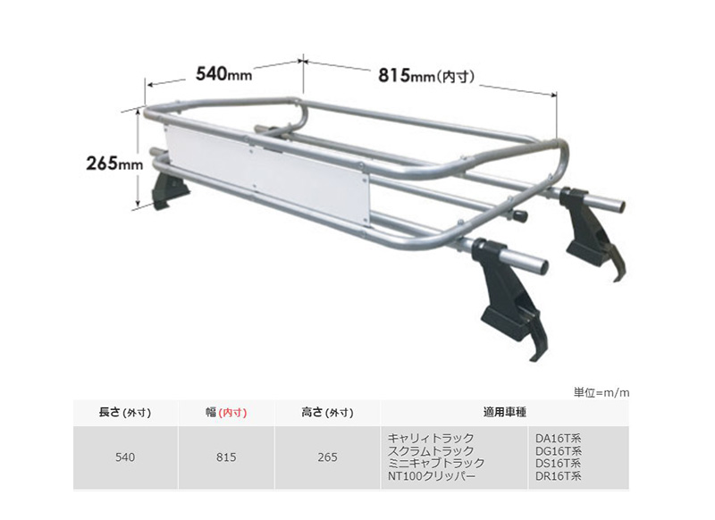 高耐食溶融めっき鋼板使用のサビに強いルーフキャリアです。スズキ キャリィトラック/マツダ スクラムトラック/三菱 ミニキャブトラック/日産 NT100クリッパー用。