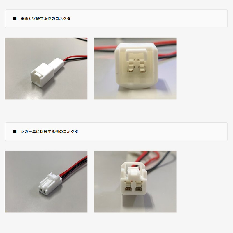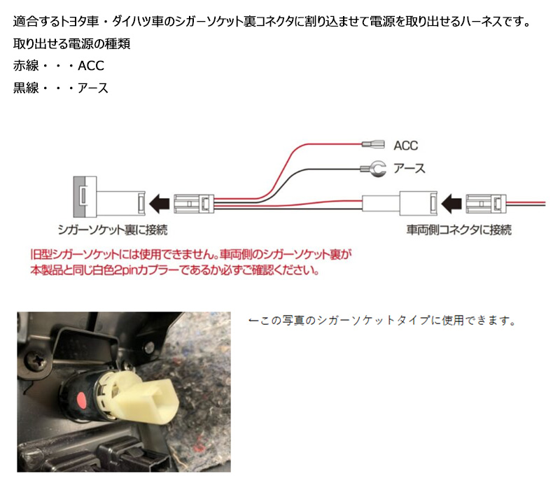 適合するトヨタ車・ダイハツ車のシガーソケット裏コネクタに割り込ませて電源を取り出せるハーネスです。