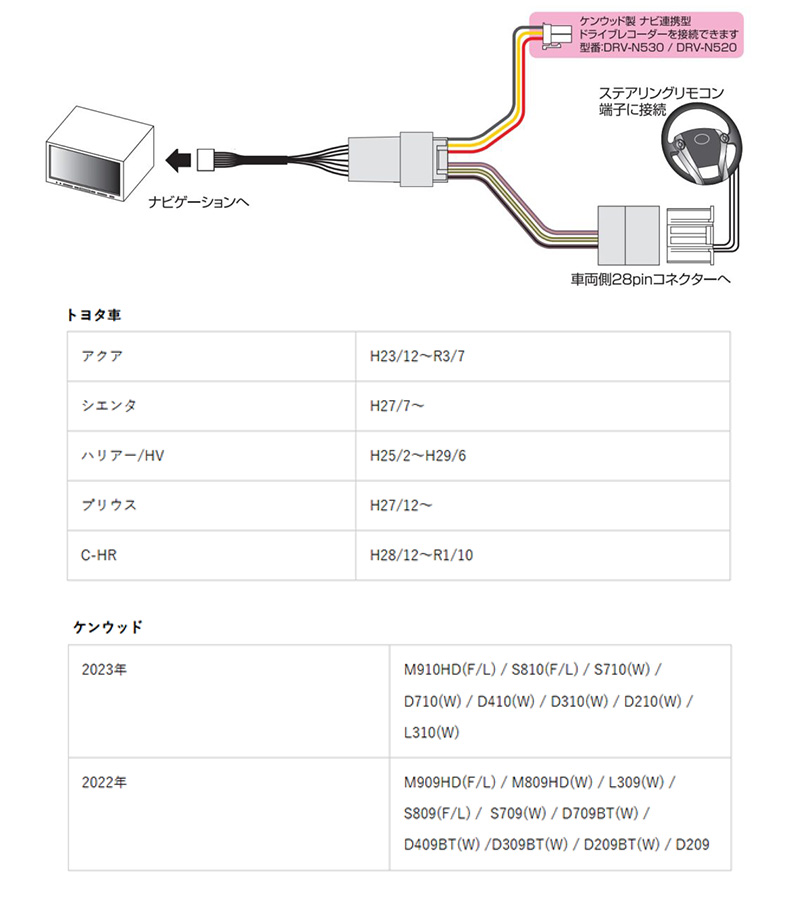 面倒な配線をすることなくトヨタ車ステアリングリモコン(車両側コネクタ28pinタイプ)とケンウッド製ナビゲーションの接続を可能にするハーネスです。