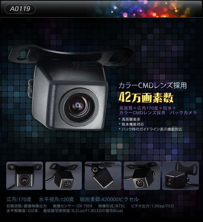 機能一覧: - 本体色:黒 - 高画質表示 - 防水機能対応 - バック時のガイドライン表示機能対応 - 広角:170度 - 水平視角:120度 - 初期状態:鏡像映像出力 - 画像センサー:OV 7959 - 映像形式:NTSC - 水平解像度:420本 - 最低被写体照度:0.2Lux/F1.8(LEDの場合0Lux) - ビデオ出力:1.0Vpp/75Ω - 動作電圧:DC 12V - 総重量:0.5kg - カメラサイズ:20mm×18mm×24mm |