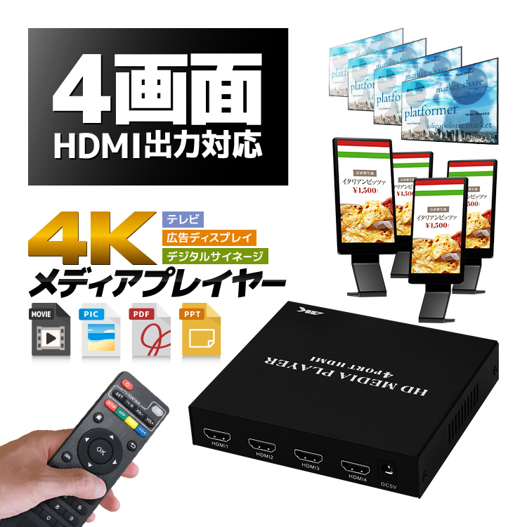 HDMI出力4個対応 同時4台テレビに 4Kメディアプレイヤー リモコン付き USBメモリ/SD/外付HDD対応 縦横表示 動画/写真/PDF/PPT デジタル広告サイネージ MP4HD