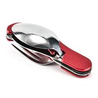 ステンレス製のフォーク スプーン ナイフ 栓抜き が一つになったマルチツール型アウトドア用カトラリーセットです。