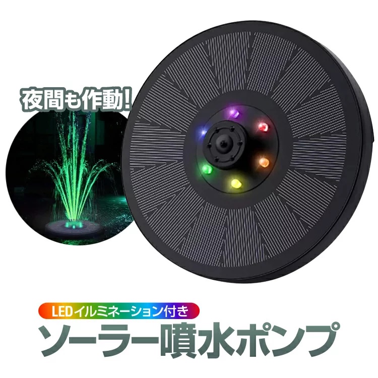 蓄電式ソーラー噴水ポンプ LEDイルミネーション付き 夜間も作動 バッテリー内蔵 フロートタイプ ノズル7種類付属 太陽光発電 園芸 魚の飼育 CSP13D1