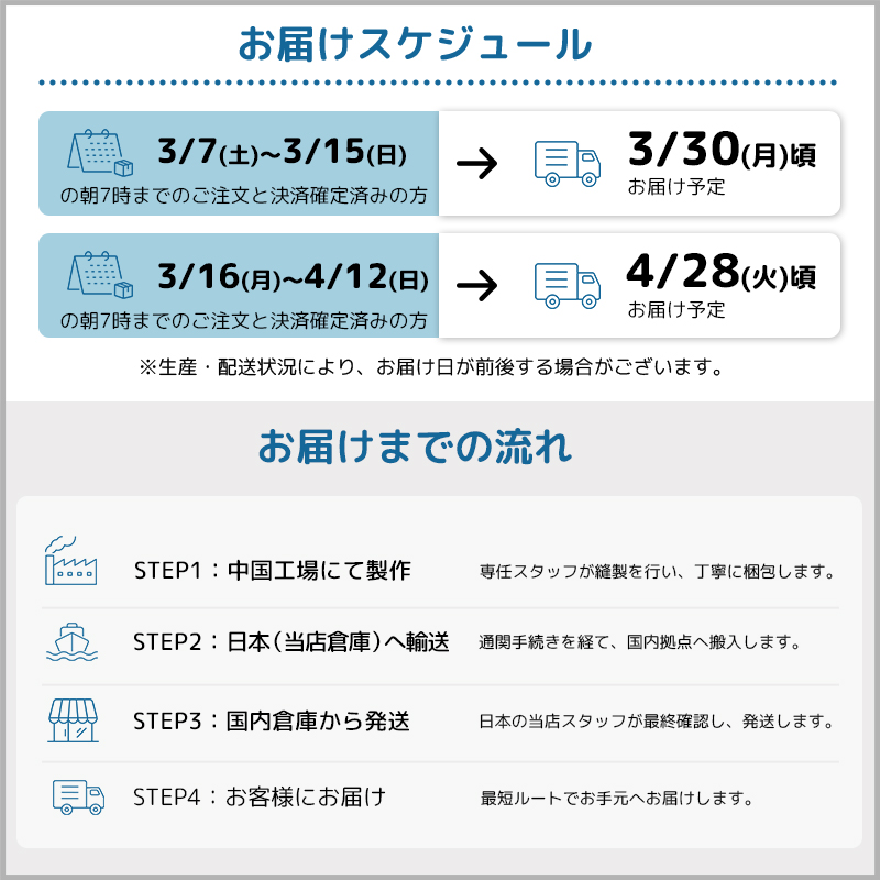 | ※受注生産品のため、お時間をいただいております。 ※交通事情等により前後する場合がございます。 |