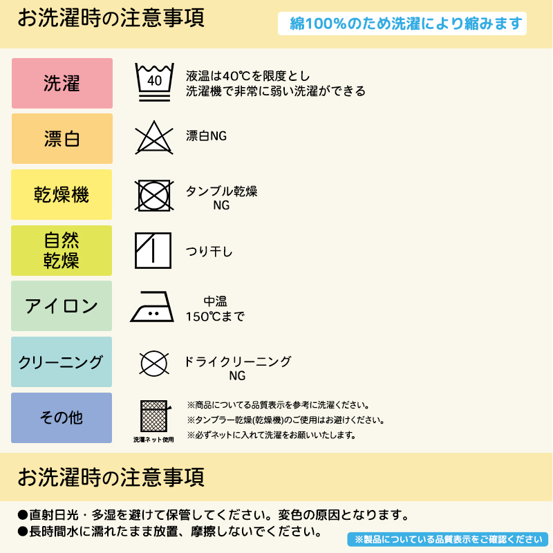 | お手入れ方法 | ●洗濯ネットをご使用下さい。 ●漂白剤及び蛍光増白剤を含んだ洗剤は脱色や変色の原因となりますのでご使用はお避け下さい。 ●水に濡れた状態で放置したり他の物と重ね合わせて放置せず、速やかに広げて干して下さい。 ●摩擦により色移りする恐れがありますのでご注意下さい。 ●品質表示に従い洗濯して下さい。 ●アイロンはあて布をしてかけて下さい。 ●直射日光、多湿を避けて保管して下さい。 ●防縮加工はしておりません。タンブル乾燥はお避け下さい。 ●素材の特性上、洗濯により多少縮む場合がございますのでご注意下さい。 |