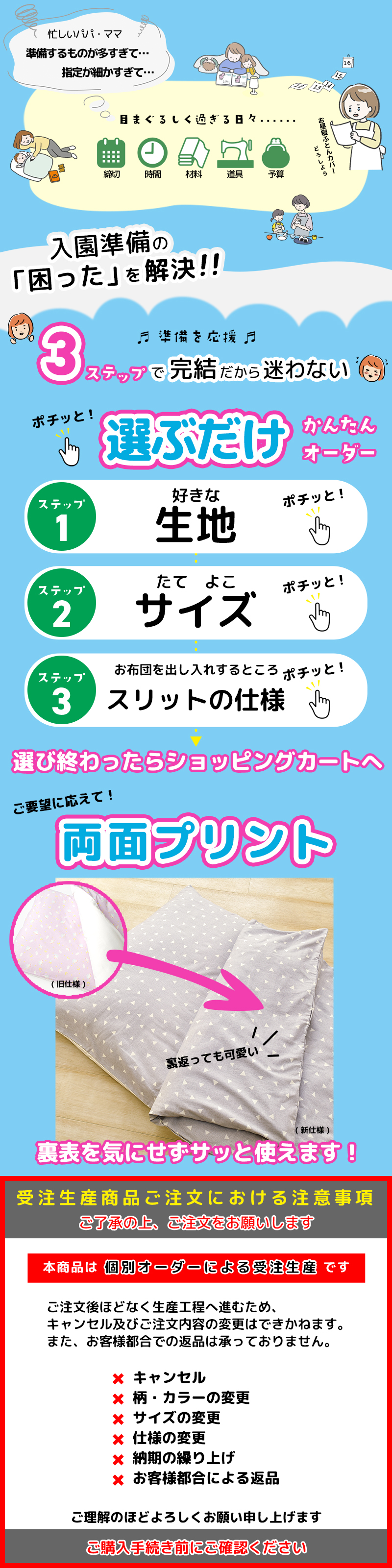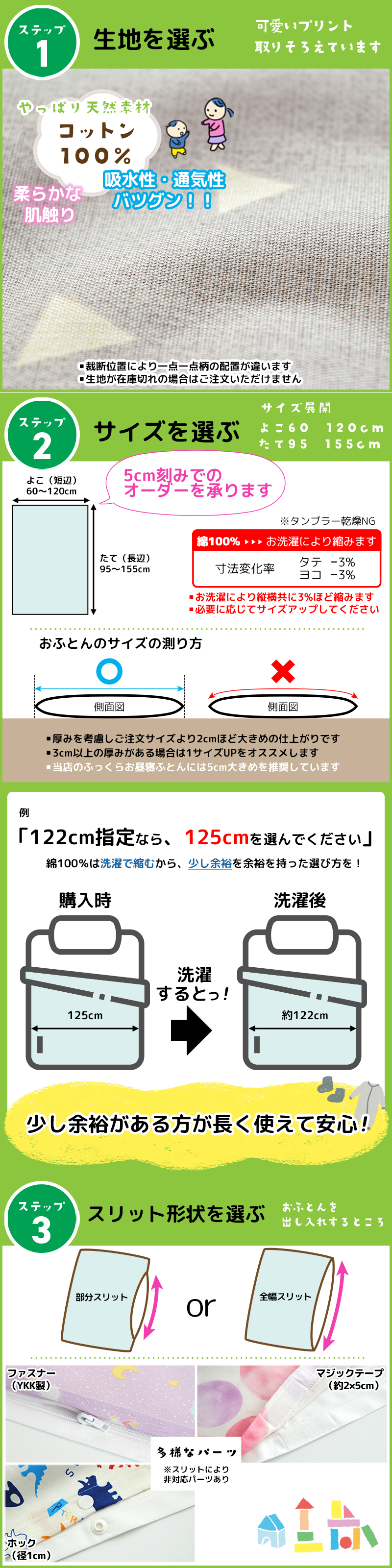 | ご注意 | ●本商品は個別オーダーによる受注生産です。 ●ご注文の時期により、発送までの期間大きく変動します。 ●発送時期の変更はできません。 ●ご注文より30分以降はキャンセルできません。 ●ページにない仕様には対応できません。 ●おふとんを固定するための内紐は付いていません。付ける事も出来ません ●おふとんの材質や厚み、カバーのスリット形状によりサイズ感は異なります。 |