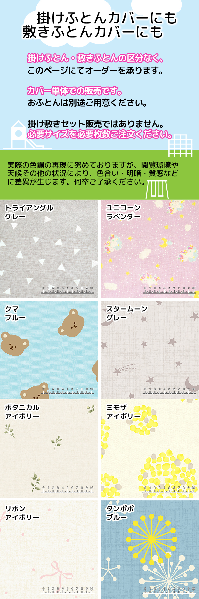 | 柄・無地 | トライアングル/グレー、ユニコーン/ラベンダー、クマ/ブルー、スタームーン/グレー、ボタニカル/アイボリー、ミモザ/アイボリー、リボン/アイボリー、タンポポ/ブルー |