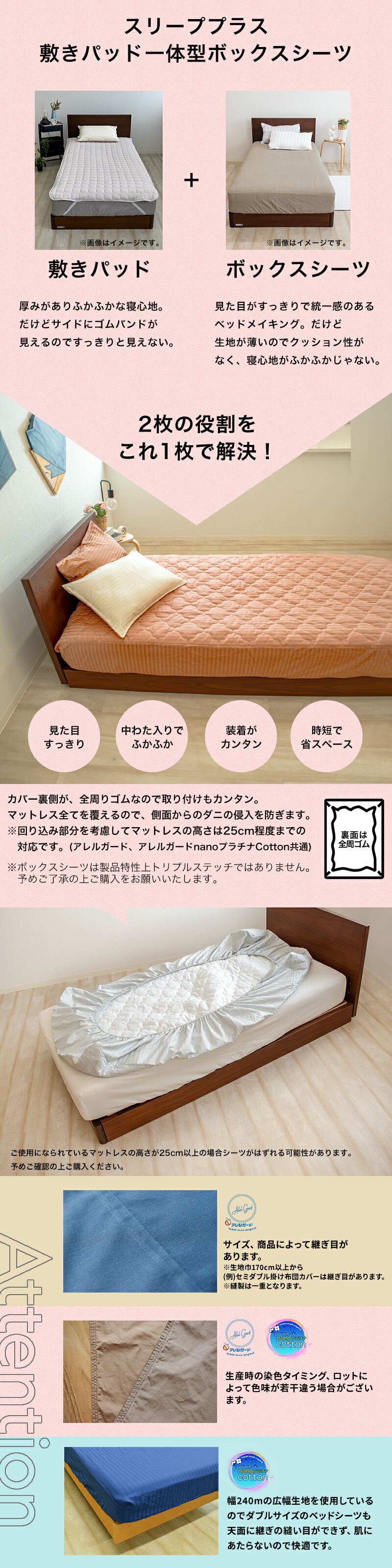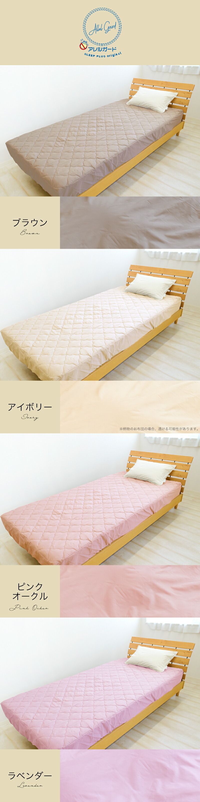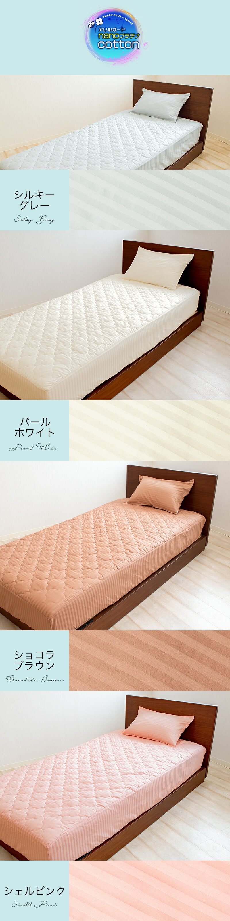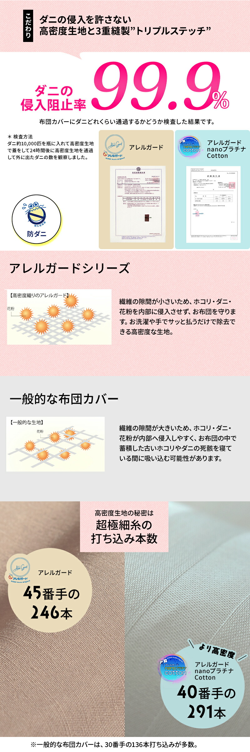 | 素材 | アレルガード 表生地:ポリエステル80%、綿20% 充填物:ポリエステル100% 裏生地:ポリエステル100% アレルガードnanoプラチナCotton 表生地:綿100% 充填物:ポリエステル100% 裏生地:ポリエステル100% |