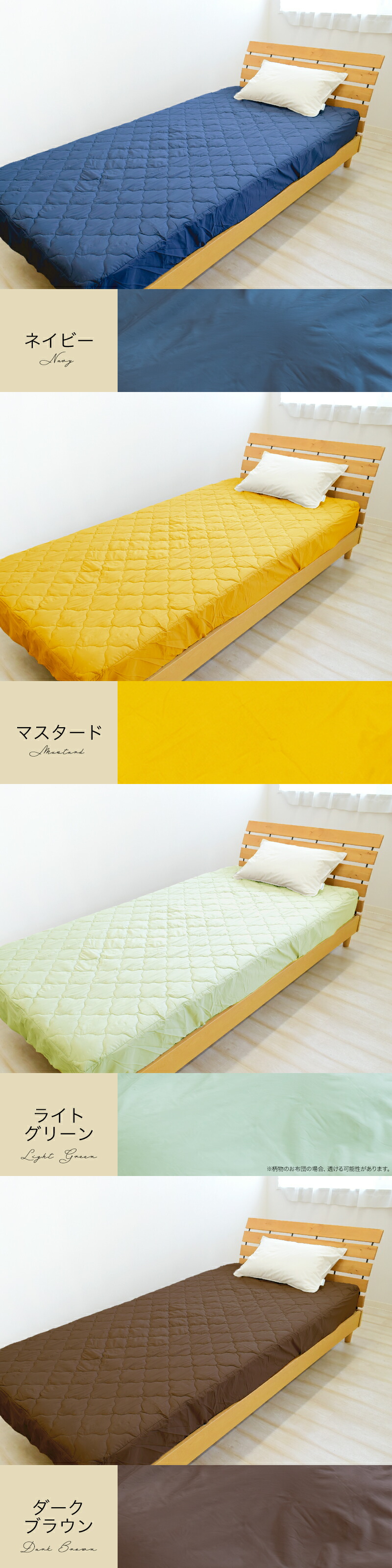| サイズ | シングルサイズ:約100×200×30cm セミダブルサイズ:約120×200×30cm ダブルサイズ:約140×200×30cm ワイドキングサイズ:約200×200×30cm (キルティング製品許容範囲+5%-3%) |