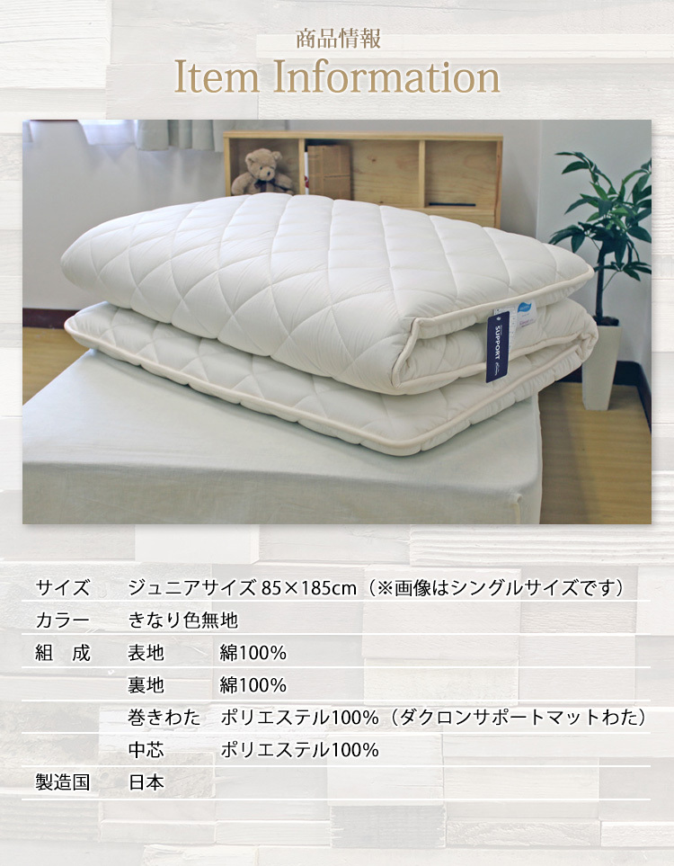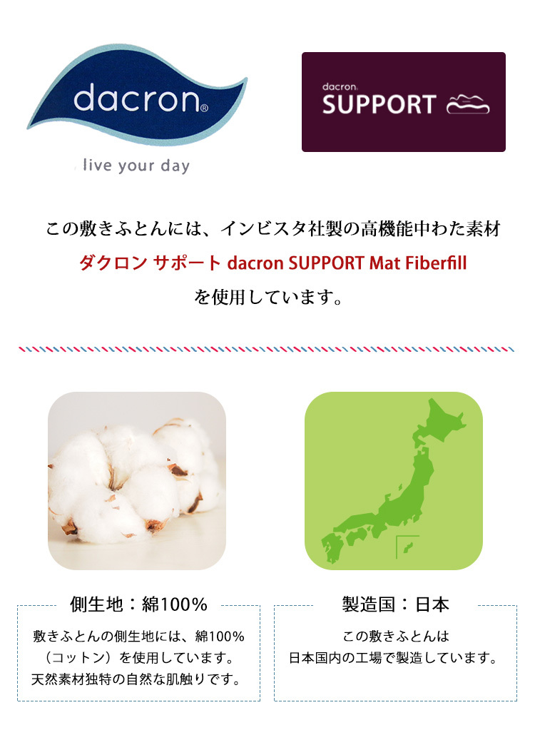 品 質:表地:綿100%、裏地:綿100%、巻きわた:ポリエステル100%(ダクロンサポートマットわた)、中芯:ポリエステル100%《日本製》