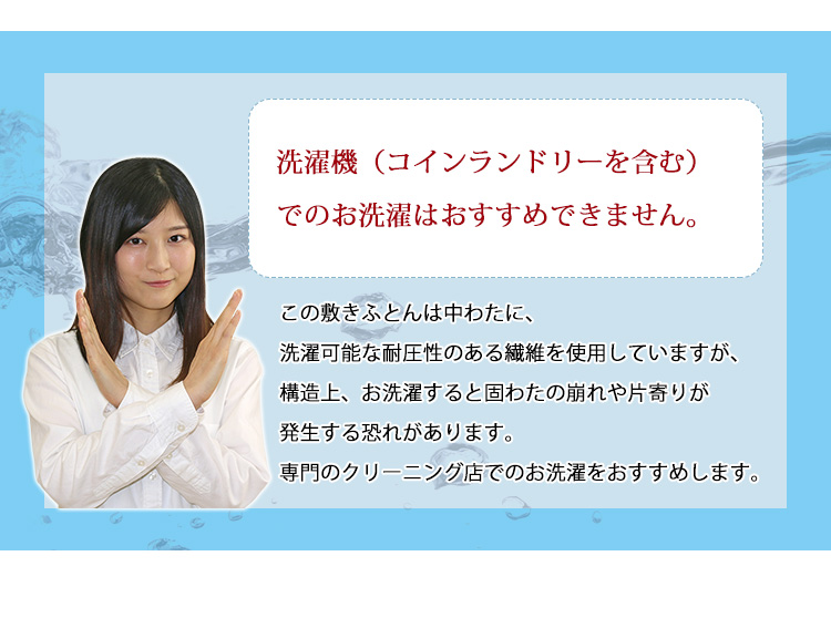 ※洗濯機(コインランドリーを含む)でのお洗濯はおすすめしておりません。お洗濯の際は専門のクリーニング店をご利用ください。
