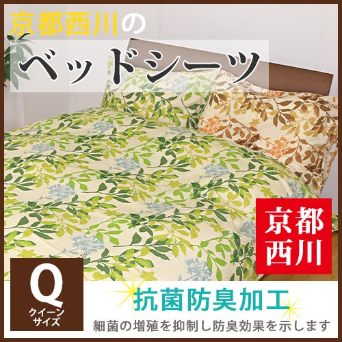 最安値に挑戦 京都西川リーフ柄 ベッドシーツ(2014-63Q)クイーン Q 抗菌防臭加工 ベッド用ボックスシーツ フラワー柄フィットシーツ
