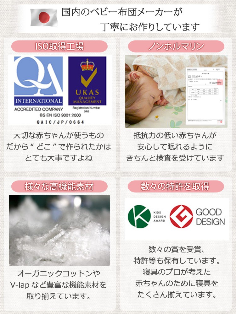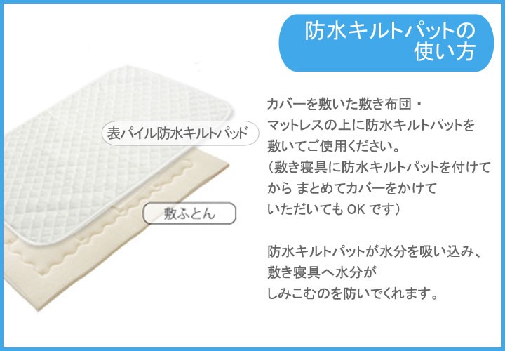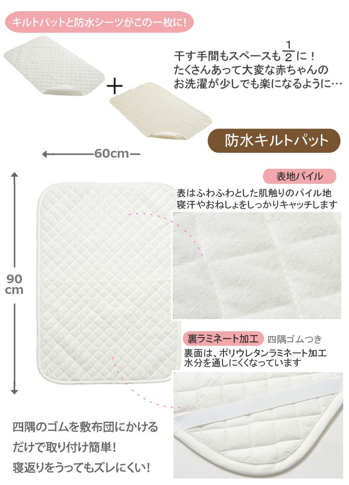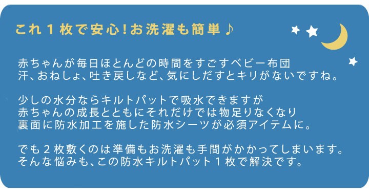 | 【商品の特徴】 肌当たりやわらかなキルトパッドと防水シーツが一枚になった便利な商品です。 赤ちゃんの敷布団やベビーマットレスに使えます。 寝汗だけでなく、よだれや吐き戻しで寝具が汚れるのを守ります。 表が綿100%のやわらかいシンカーパイル生地、裏はポリウレタンラミネート加工がされているので、水分や敷布団やマットレスに染みこむのを防ぎます。 日本製、ISO取得工場で生産されているので、安心安全! ご家庭の洗濯機で洗えるので、汚れた時にもすぐに洗えていつでも清潔。 お洗濯の時は洗濯ネットに入れてください。 -----こんなキーワードで検索されています---- ミニベビー ミニ ミニサイズ コンパクトベビー コンパクト コンパクトサイズ リトルベビーベッド 省スペース ポータブルベビーベッド ベビー ベビー布団 ベビー敷布団 ベビー敷き布団 ベビー敷ふとん ベビー敷きふとん ベビーマットレス ベビーマット ベッドマット 赤ちゃん 子ども 子供 こども 男の子 女の子 ユニセックス 敷きパッド 敷きパット 安心 洗える 洗濯 洗濯機 ウォッシャブル 防水 防水シーツ おねしょ おねしょシーツ 吐き戻し オムツ漏れ おむつ漏れ 寝汗 汗 汚れ防止 防汚 無地 シンプル 定番 人気 春 夏 春用 夏用 オールシーズン | |