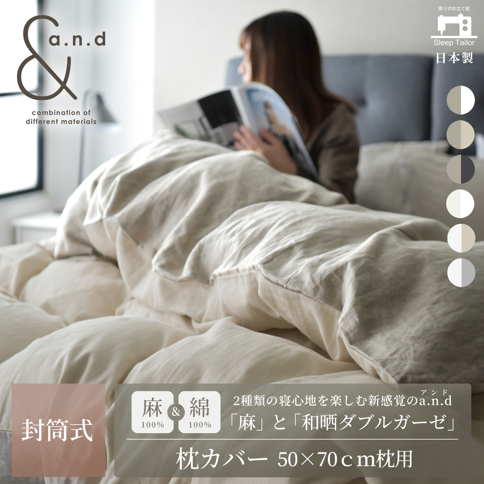 枕カバー 50×70cm枕用 リネン 和晒し綿ダブルガーゼ 2種類の寝心地 日本製 綿100% 麻100% フレンチリネン 冬 あったか 【a.n.d】
