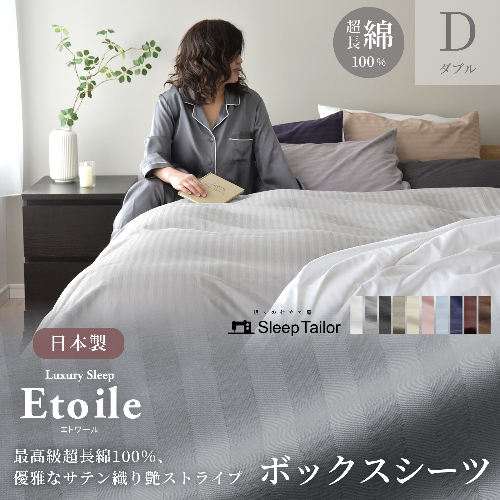 日本製 超長綿 ボックスシーツ マットレスカバー ベッドシーツ ダブル エトワール 高級ホテル仕様 綿100% サテン ストライプ 防ダニ 北欧 おしゃれ